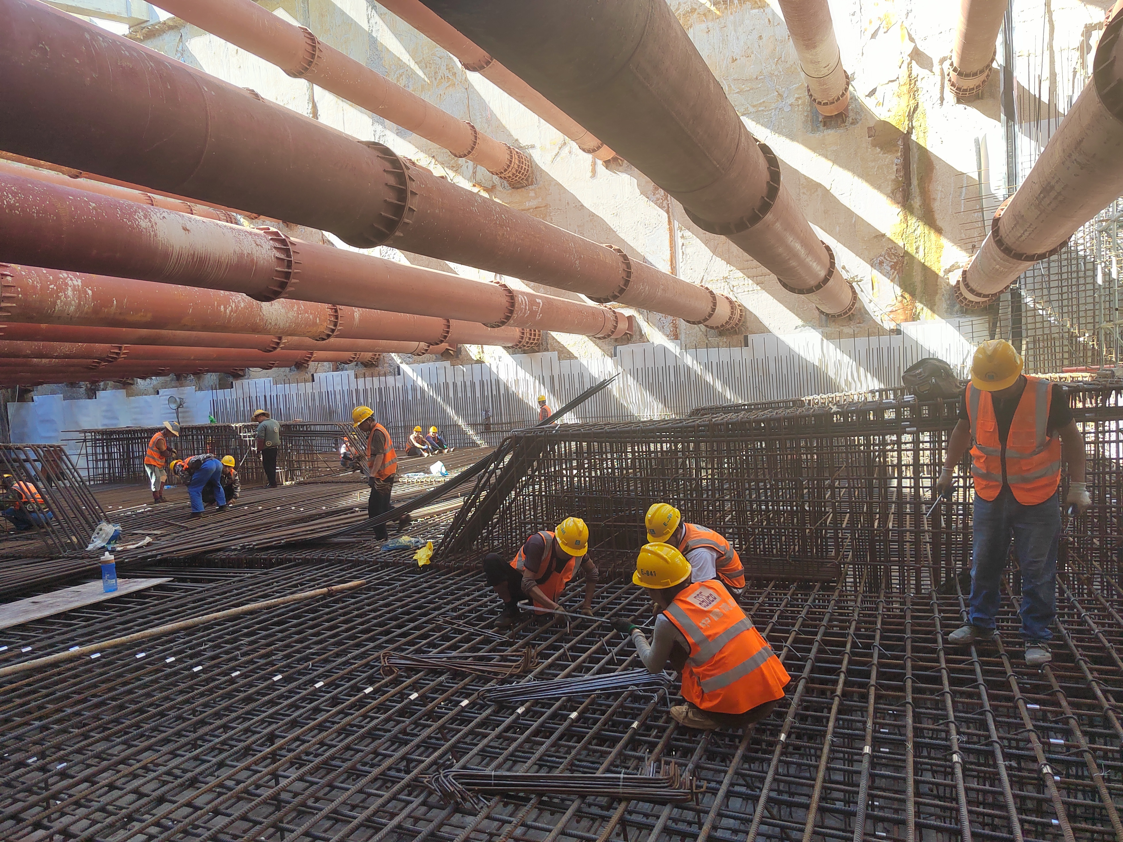車站基坑開挖至見底層為風(fēng)化巖土層,由于無(wú)法有效降水給下翻梁及找平施工造成了巨大挑戰(zhàn),為此項(xiàng)目公司組織各方共同謀劃、多次嘗試,最終通過采用明水抽排、預(yù)埋排水管和改良土質(zhì)等措施予以解決;由于逆做頂板下方施工空間不足鋼支撐假設(shè)尤為困難,為此項(xiàng)目公司不斷優(yōu)化施工部署,緊盯節(jié)點(diǎn)目標(biāo),采取逆做頂板外3米作為收底面,留沙為鋼支撐架設(shè)提供堆料平臺(tái),內(nèi)部架設(shè)采取土方掏槽施工,挖機(jī)配合架設(shè)的方式施工;在主體施工期間,項(xiàng)目克服了南昌夏季高溫、暴雨天氣的困難,采取錯(cuò)峰上班、24小時(shí)輪流作業(yè)的方式施工,現(xiàn)場(chǎng)常備鹽汽水、藿香正氣水、鼓風(fēng)機(jī)、沙袋、水泵等防暑、防汛物資,預(yù)防作業(yè)人員中暑、增強(qiáng)防汛意識(shí),全力保證進(jìn)度安全兩不誤。