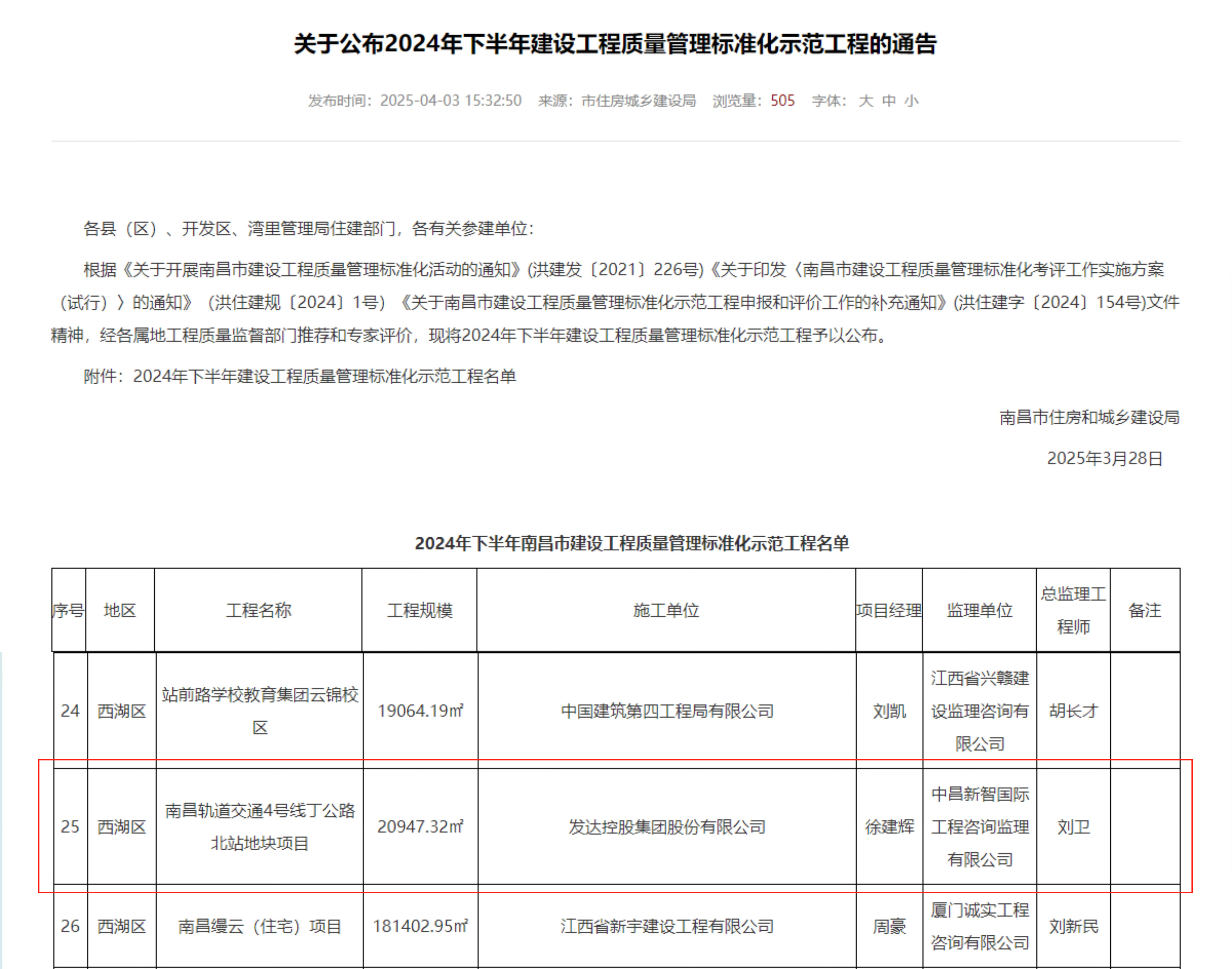 近日,4號(hào)線丁公路北站地塊項(xiàng)目傳來喜訊。該項(xiàng)目在2024年上半年全市建設(shè)工程質(zhì)量標(biāo)準(zhǔn)化示范工程評(píng)選中榮獲“建設(shè)工程質(zhì)量管理標(biāo)準(zhǔn)化示范工程”稱號(hào),這是繼2023年獲評(píng)“市級(jí)建筑施工安全生產(chǎn)標(biāo)準(zhǔn)化示范工地”后,再度獲得市級(jí)權(quán)威認(rèn)可,標(biāo)志著南昌地鐵開發(fā)建設(shè)的工程質(zhì)量與管理水平邁上新臺(tái)階!