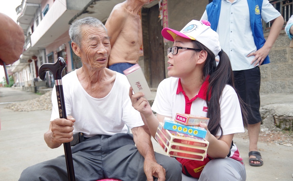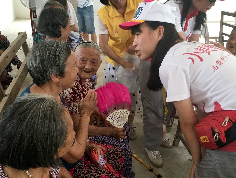 活動當天,“小鮮鷺”志愿者們?yōu)?0位75歲以上的空巢貧困老人免費發(fā)放了拐杖和夏日防暑包,并為老人們送上了一場自編自導自演的文藝匯演。志愿者們還入戶到老下村的榨下自然村,為行動不便的老人送去防暑用品。